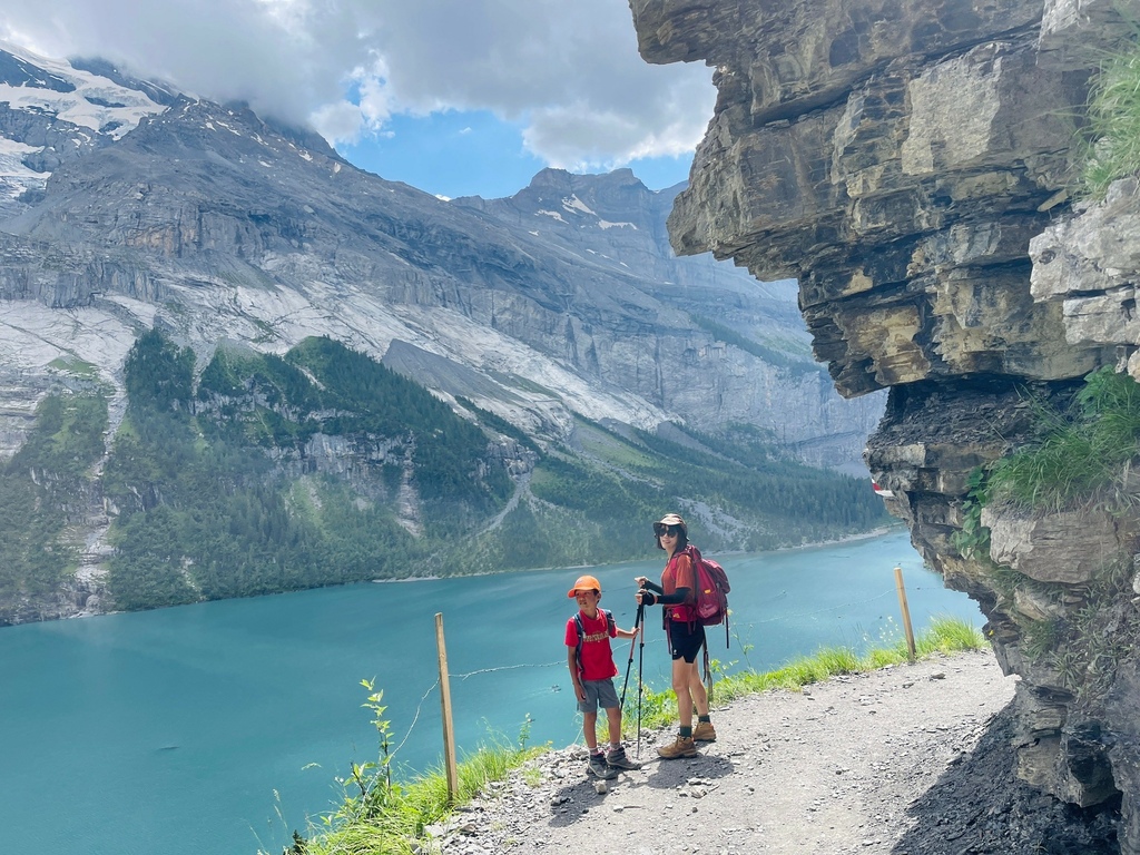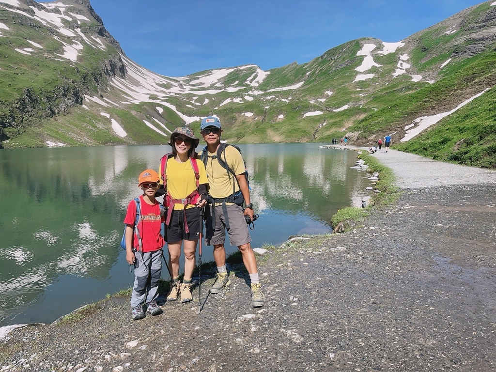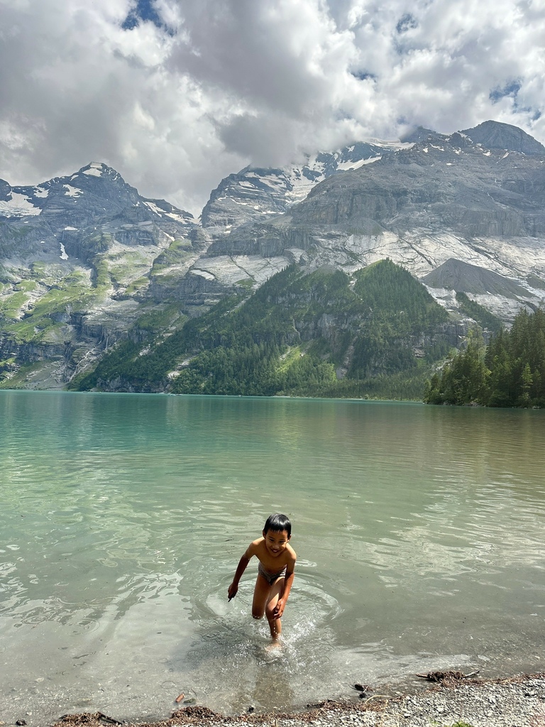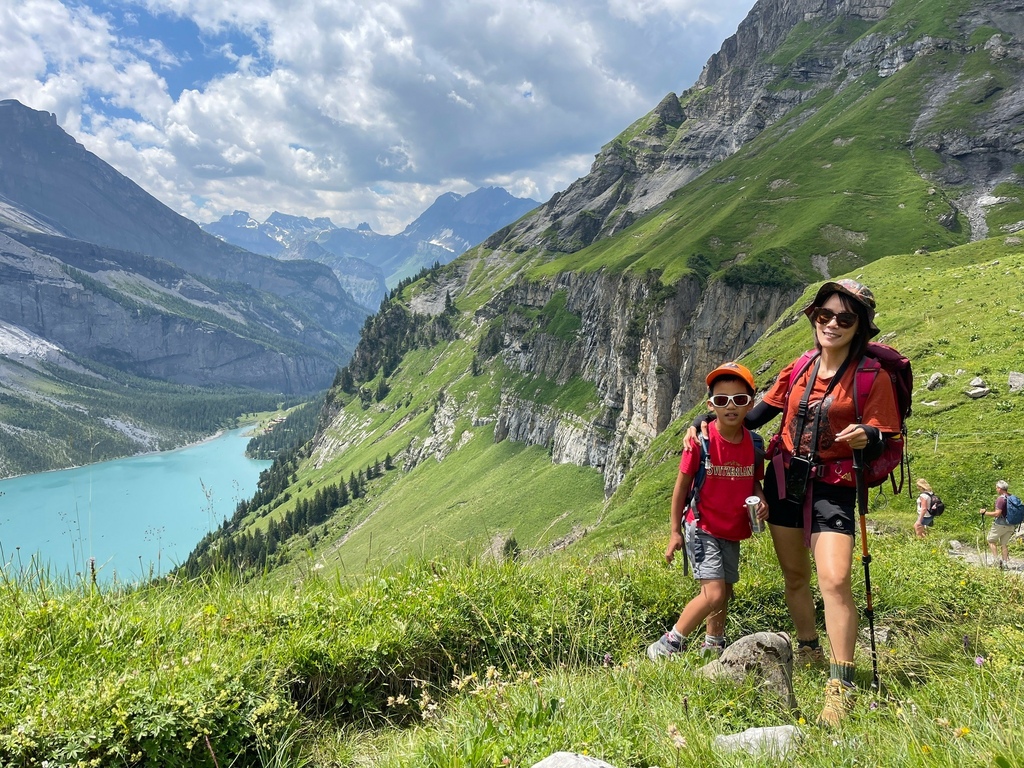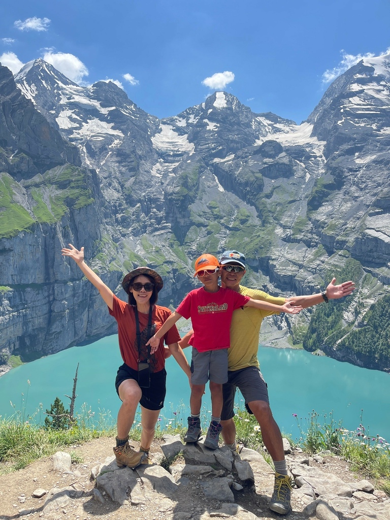 位於瑞士西部伯恩州的 Oeschinensee 可是夏日瑞士當地人和遊客戲水的聖地,選擇從纜車站走完 8.7 公里 Scenic Hike Loop Trial 的人比湖邊戲水、野餐、看看湖光山色的遊客少很多,然而,要看見土耳其藍只有11號公車可以抵達,這條路線後半部像極了通過大霸尖山基底的感覺,視覺的衝擊和腳下的路徑寬度成反比,再天氣極佳的狀況下,我們一家三口就走在明信片裡。