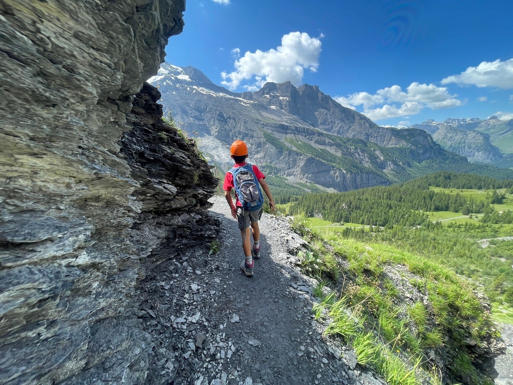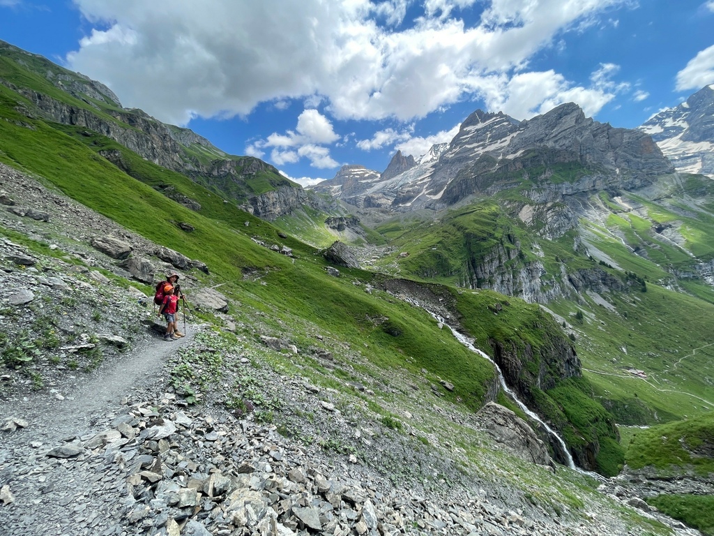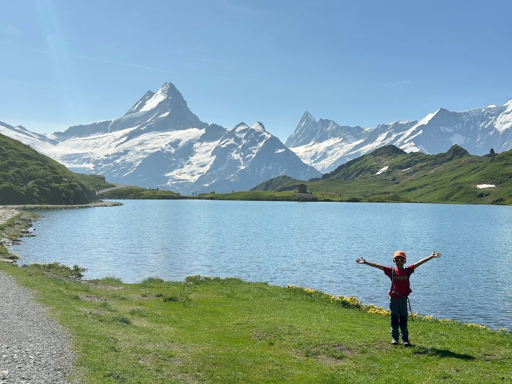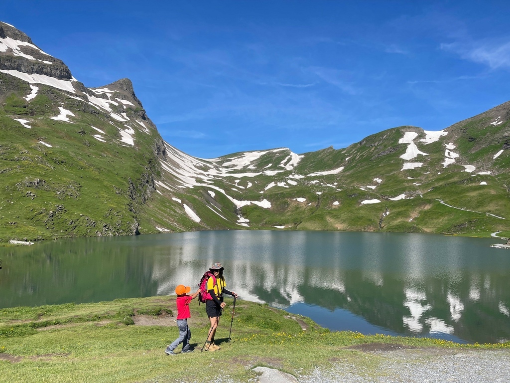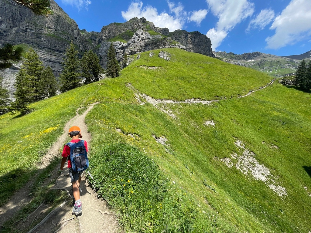 位於瑞士西部伯恩州的 Oeschinensee 可是夏日瑞士當地人和遊客戲水的聖地,選擇從纜車站走完 8.7 公里 Scenic Hike Loop Trial 的人比湖邊戲水、野餐、看看湖光山色的遊客少很多,然而,要看見土耳其藍只有11號公車可以抵達,這條路線後半部像極了通過大霸尖山基底的感覺,視覺的衝擊和腳下的路徑寬度成反比,再天氣極佳的狀況下,我們一家三口就走在明信片裡。