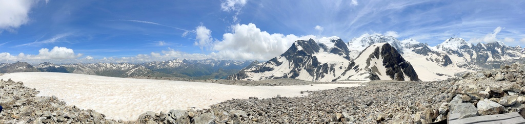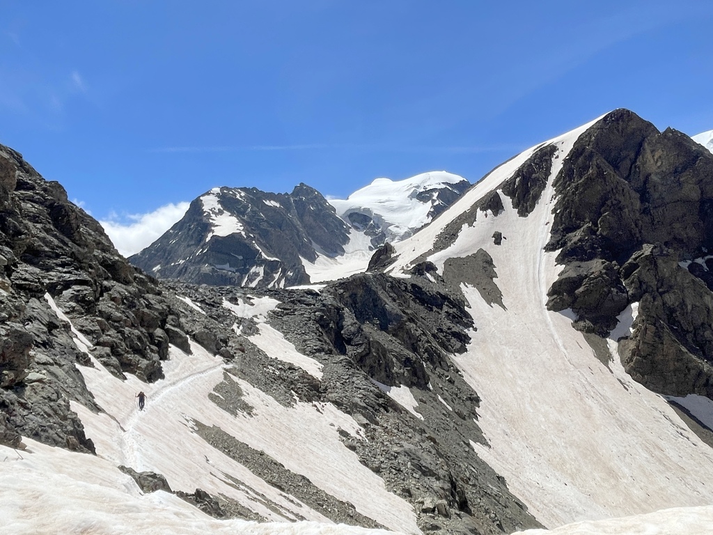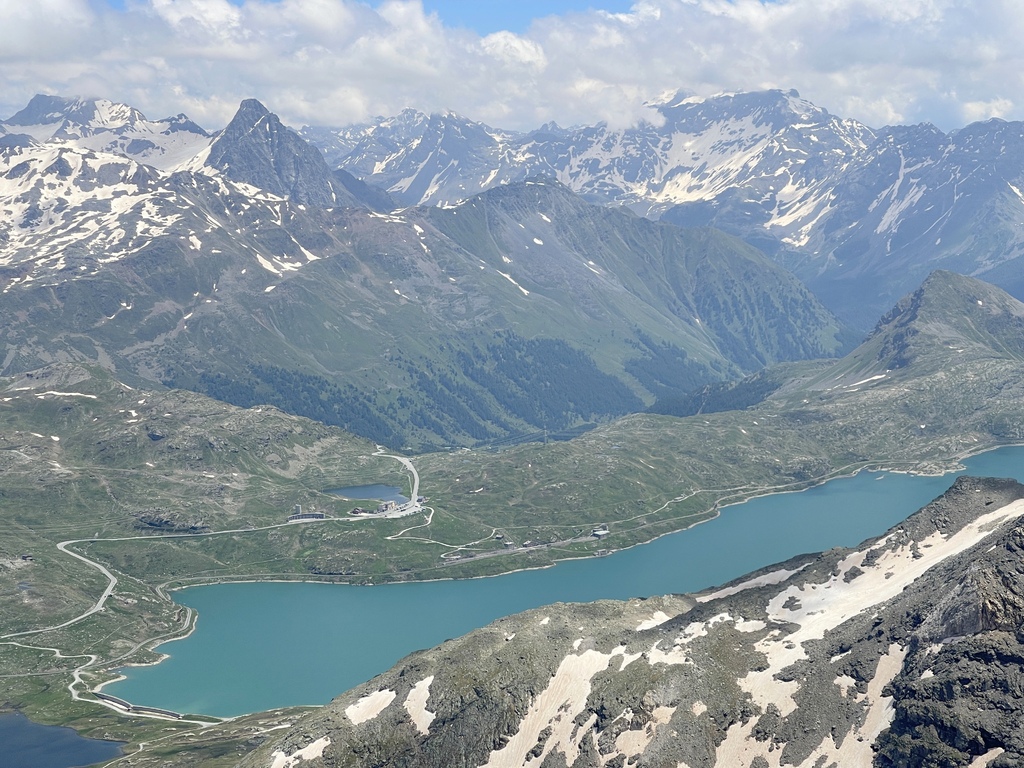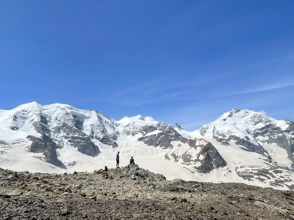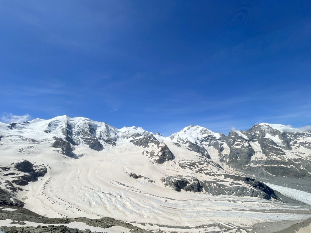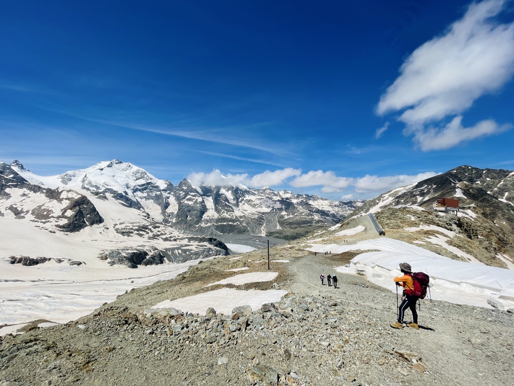 此行原本的計畫是從山下開始起登,然後健行到 Diavolezza (女妖峰)平台看冰河的,售票人員告知我前往山頂的部分路段仍有積雪而封閉,於是,只能先搭纜車到山頂,然後發覺有幾位山友往更高積雪的山頂攻去,我看了看地圖,決定且戰且走,不走還好,一走才發現自己被積雪高山環抱著,儘管需要經過積雪很厚的幾處,小心翼翼通過之後,等在上頭的就是滿滿的驚喜,官方網站是這麼形容的:Once you reach the top, an unforgettable panoramic view opens up before you. You can see not only the Bernina range, but also further into Val Poschiavo and Valtellina.