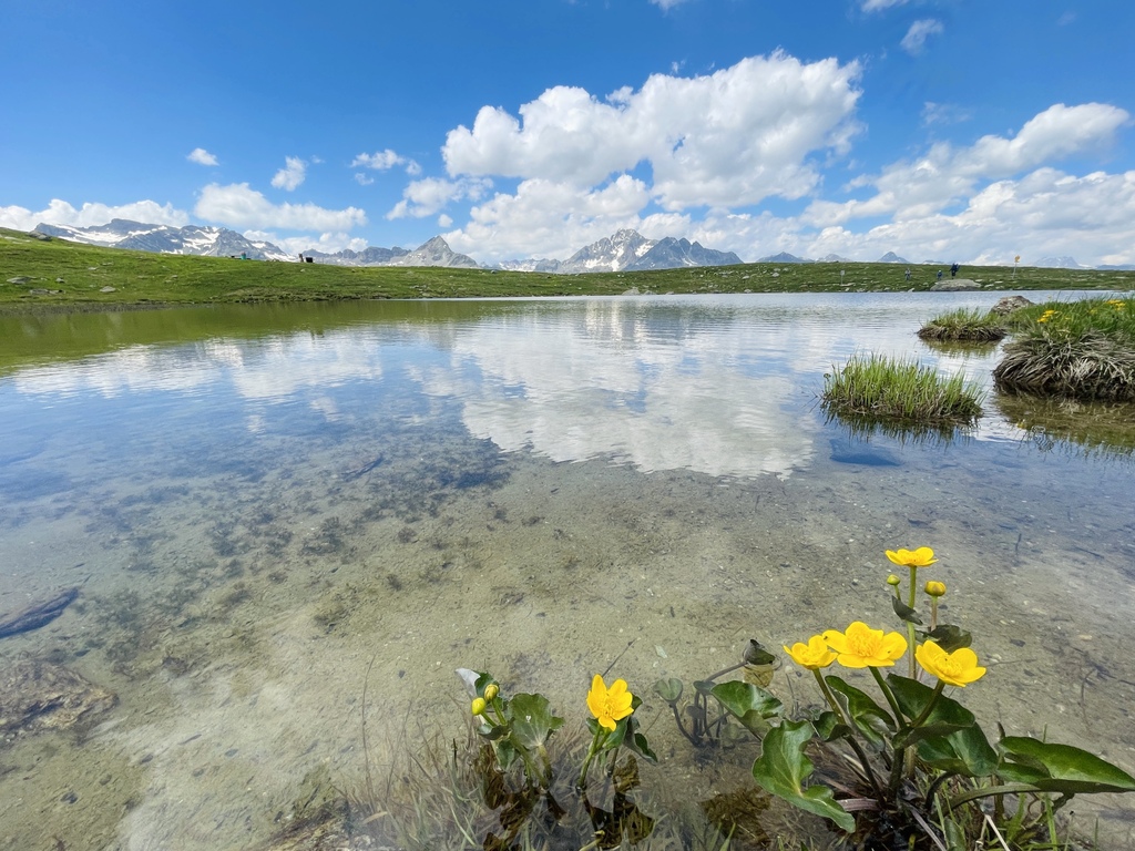 Discover the unique high-alpine flora and lake landscape of the Upper Engadine on this hiking circuit to the six 6 Lejins (Romansh: small lakes). The lakes are named after the minerals and rock types they contain. 六湖繞一圈將近 6 公里,海拔爬升 420 公尺,也下降 420 公尺,意味著需要在山裏頭野上野下,還好這條步道太好玩了,要玩雪或是玩水,甚至拍出帥氣或是美美的登山照接難不倒這條步道。