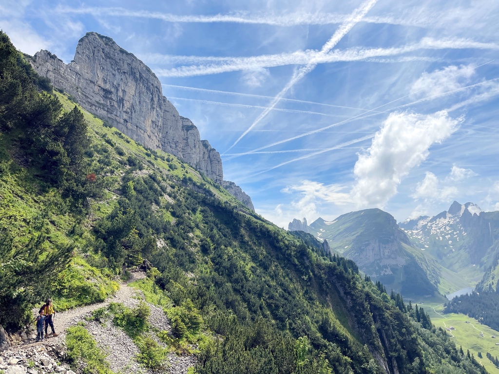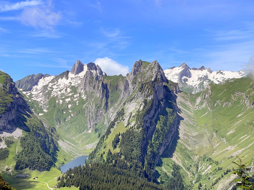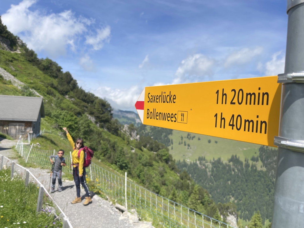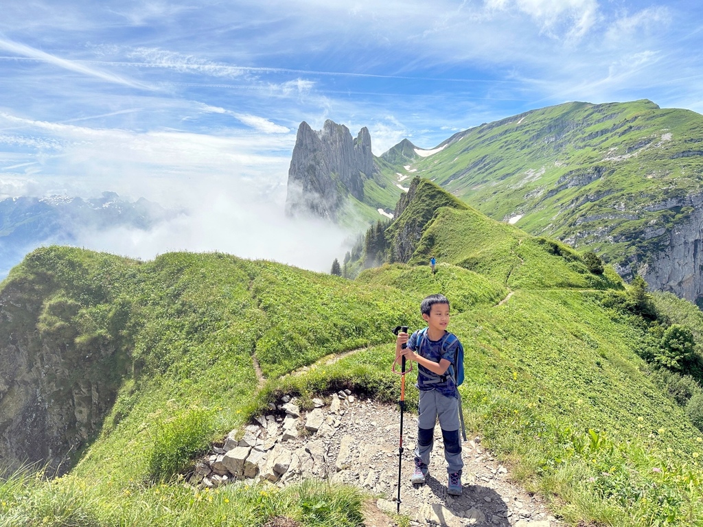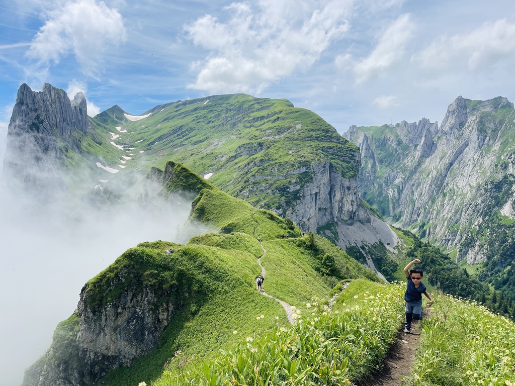 位於Appenzell 的Saxer Lücke 最高點海拔1822 公尺,我得承認我一開始就是被那特殊又聳立的山頭吸引的,咱家三口選擇從Staubern纜車站搭到山頂開始起登,一開始的絕美大景混合了高山湖泊和積雪,伴隨著寬度略小的步道上上下下卻也刺激,眼睛一直盯著最遠也最吸引目光的Saxer Lücke,來回6公里左右,走走停停4小時內可完成,沿途遊客不多,適合有人群恐懼症的旅人。