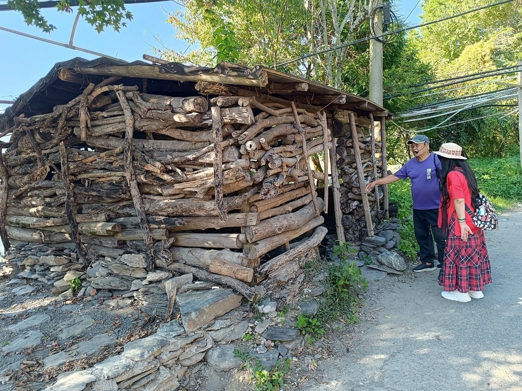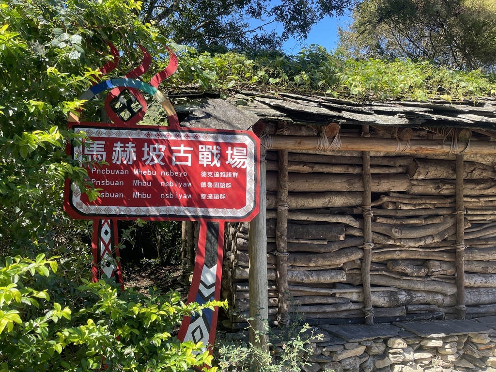 ↑回程步行經過馬赫坡古戰場,一旁矗立賽德克式傳統綠建築,建材就地取材,屋圍以大石頭做地基,屋內保留原始泥地,而後以木頭搭建含有間隙與窗戶的外牆,屋頂則用樹木做屋樑再鋪上石板。