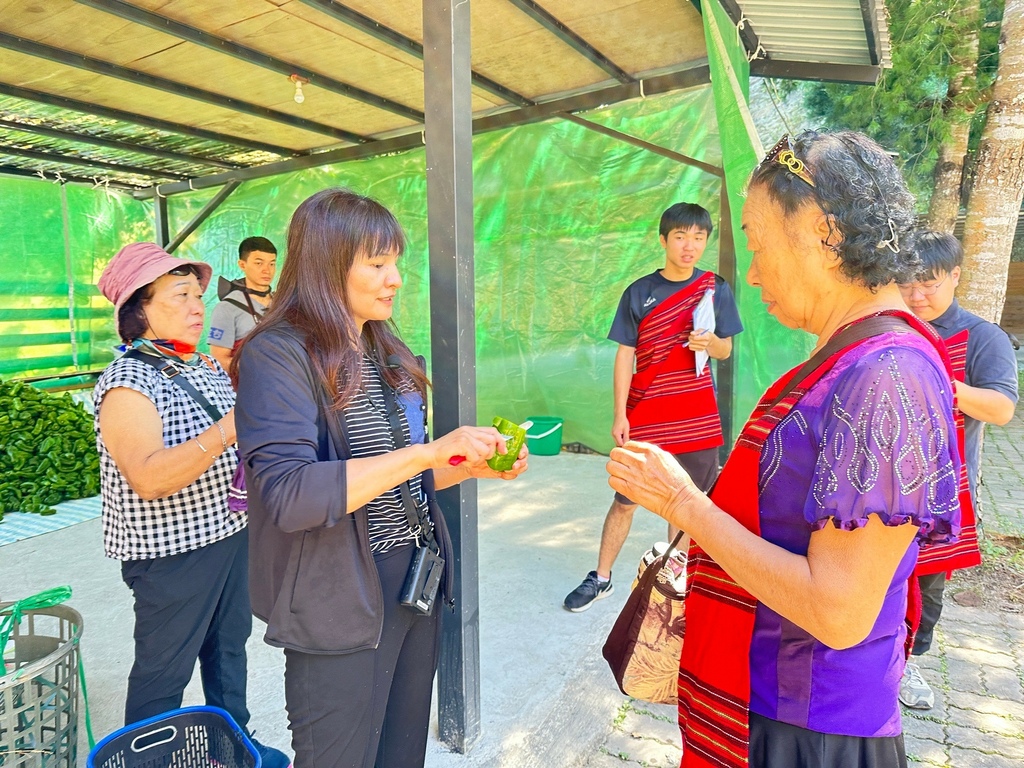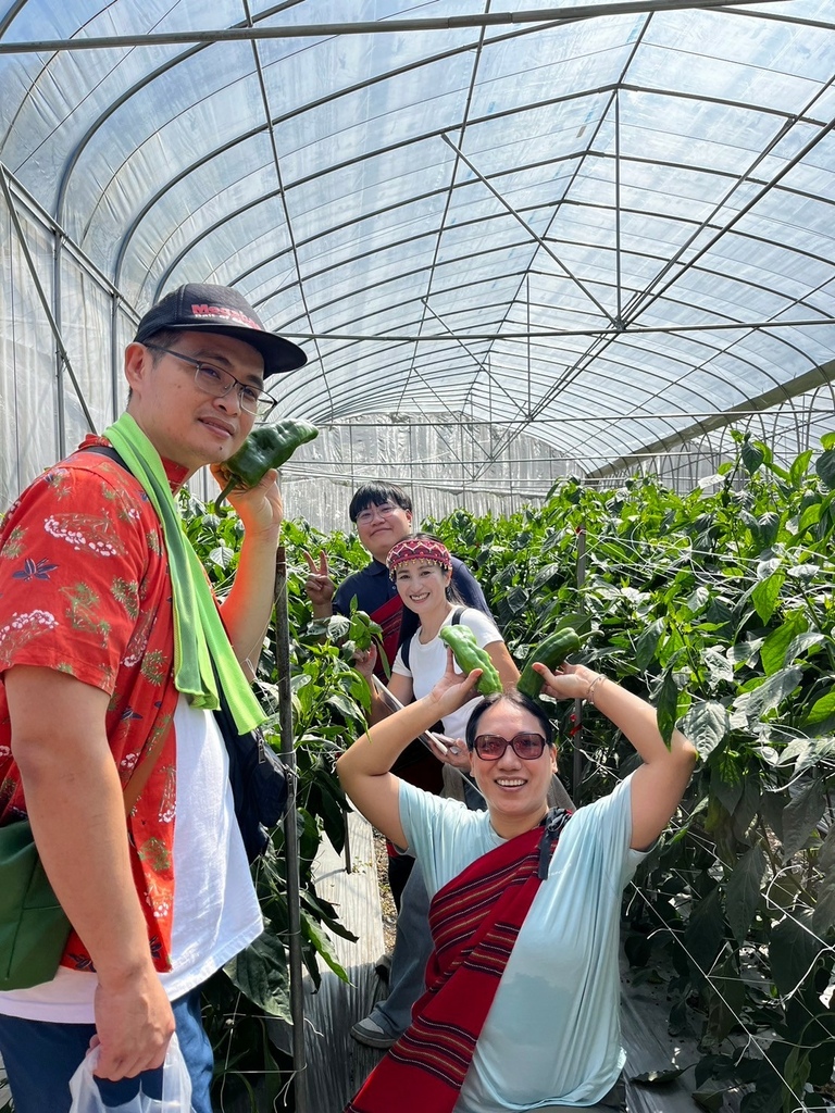 ↑接下來則安排了親採青椒的體驗活動,一梯次五個人進入由當地政府補助的簡易溫室內以由下往上的採下青椒,透過溫室摘種,一年可收成五到六次,導覽員甚至現場切了一片片青椒讓大家品嚐,出乎意料之外的是青椒一口咬下,微甜的滋味立刻在舌尖蔓延,打破大家對青椒的刻板印象。