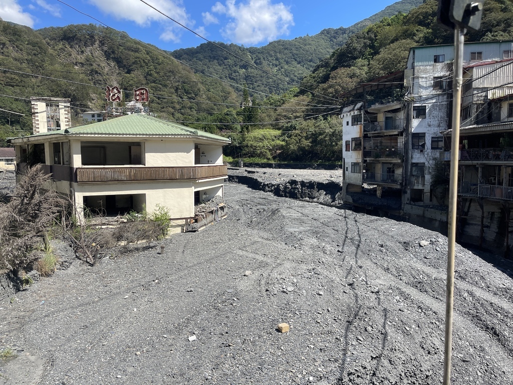 ↑午餐則穿過廬山吊橋前往當地餐廳用餐,團員見證了當初卡努颱風單日降雨超過600毫米,並使得塔羅灣溪因而溪水暴漲淹沒了兩側建築物一樓的威力時,莫不感傷不已。當土石堆滿河道,下次大水也有可能再度漫流,團員對於以往對於廬山溫泉的記憶似乎也被深埋在河床底,只期待廬山溫泉的榮光有機會再現。