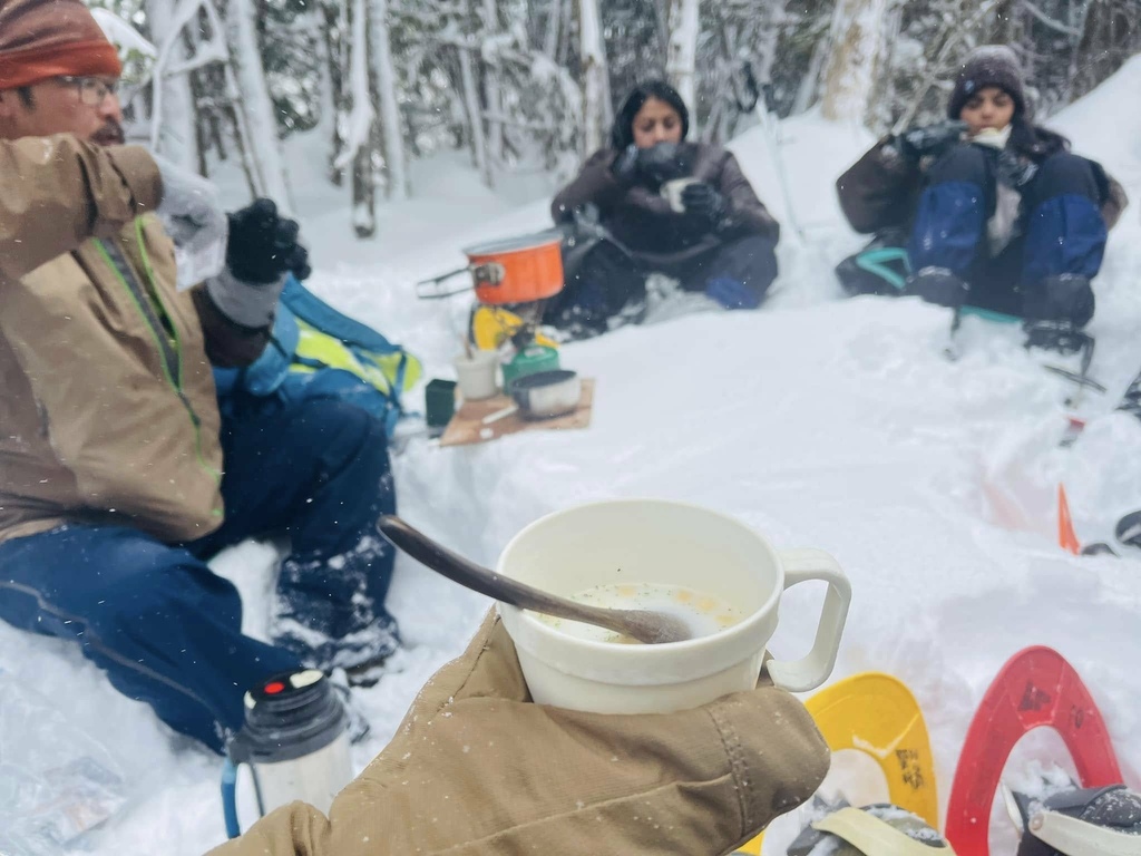 ↑午餐時間響導挖了一個臨時的野餐桌,煮上熱咖啡給大家配午餐,別以為煮東西是很簡單的事,當要在零下七度的環境下脫掉手套使用瓦斯爐、倒熱水等簡單動作都變得異常艱辛。