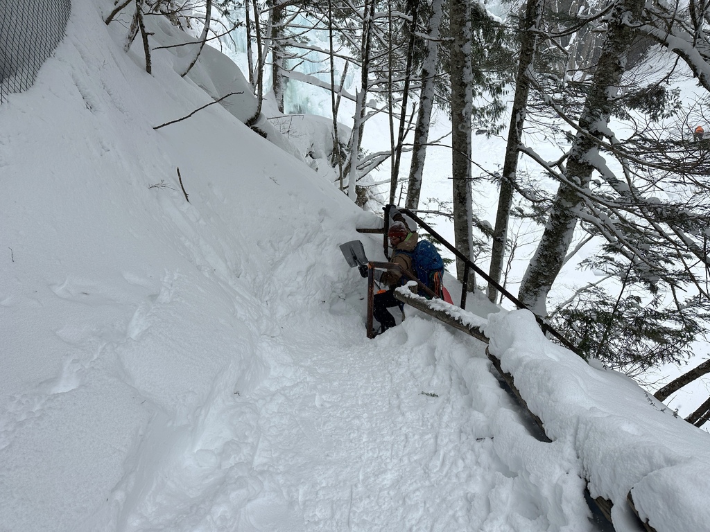 ↑抵達善五郎瀑布前的最後一段下坡以及樓梯其實非常得滑,嚮導拿出背包裡的小圓鍬把階梯的冰雪除掉,他一直告知要小心,不然就要bye bye了。